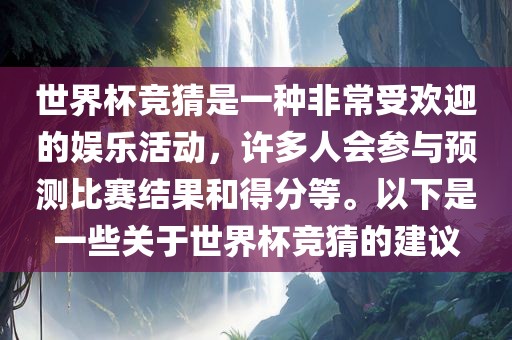 世界杯竞猜是一种非常受欢迎的娱乐活动,许多人会参与预测比赛结果和得分等。以下是一些关于世界杯竞猜的建议